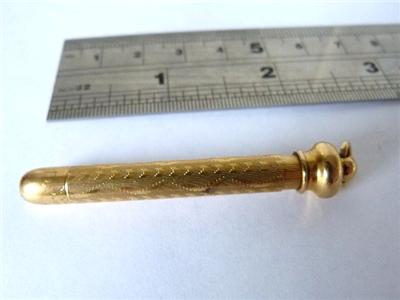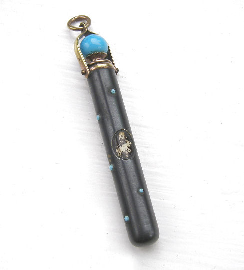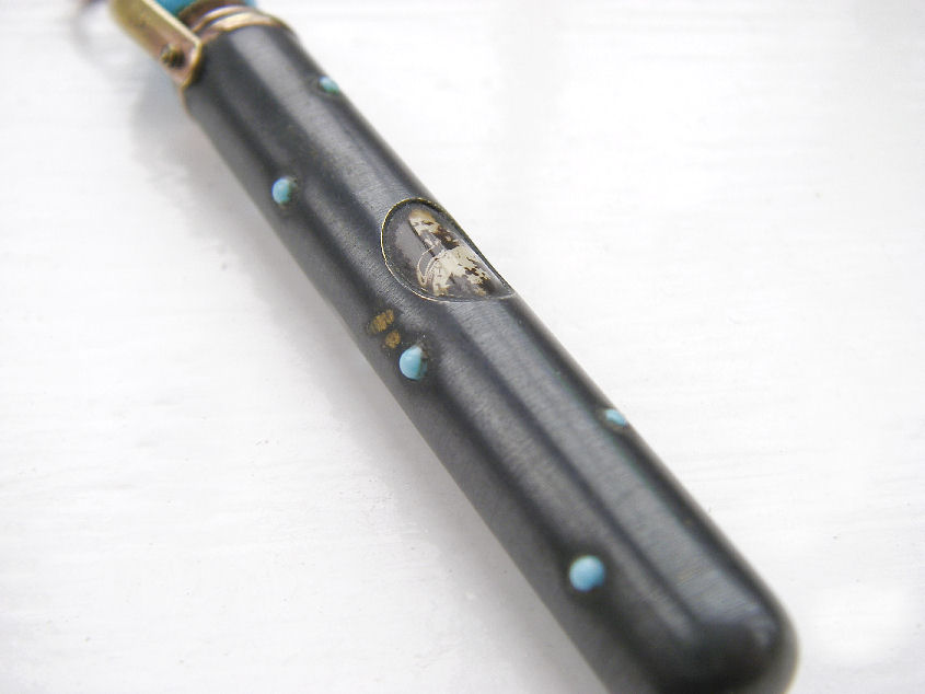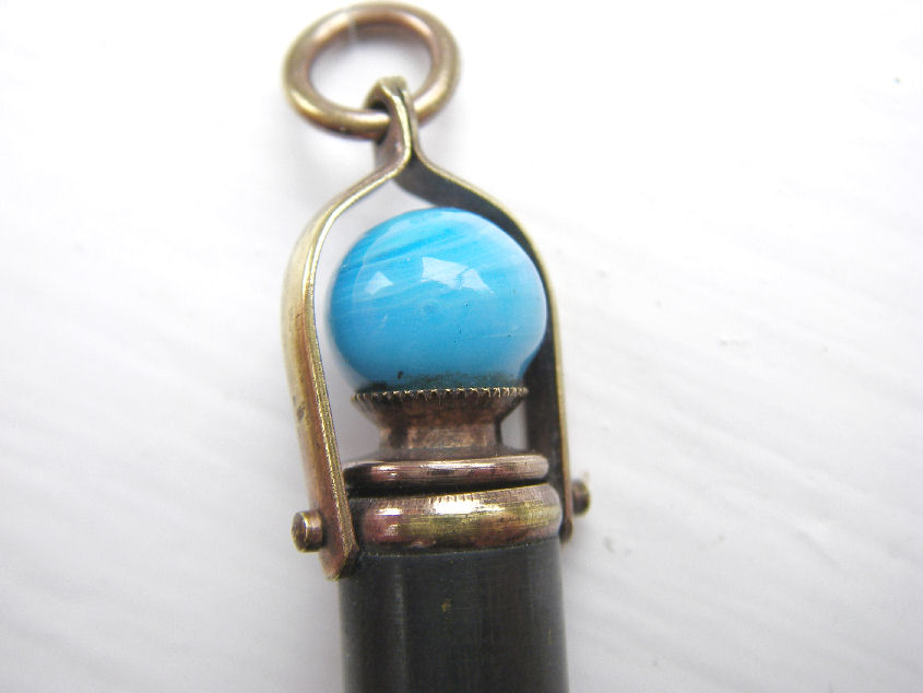 In these pictures the pen with the blue topper and the picture of King Edward on it is very rare and is Edwardian – probably 1901. The pen with the amethyst topper is also Edwardian but from 1910. The third pen, which telescopes and is made to hand on a fob is not as old.