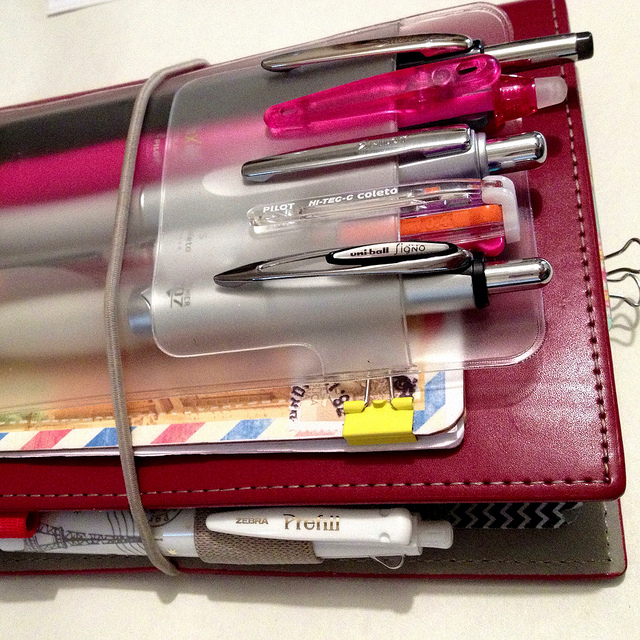 I chose the personal size because it is big enough to write in comfortably, yet small enough to carry in my purse and have with me all the time. (I tried the pocket size first and found it much too small. Now that my business is up and running I do use an A5 binder for work, but it stays on my desk.) I chose the Domino because it is pretty and it has the rubber band so I can easily tuck in a receipt, an extra notebook, or a bunch of pens.