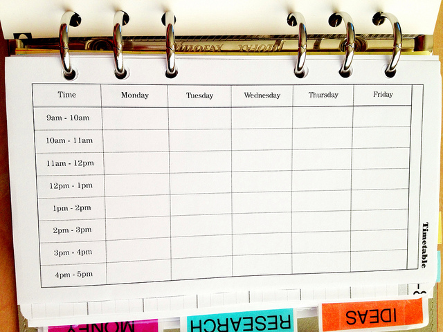 Grids are awesome. This timetable format is especially helpful if your daily routines differ throughout the week, as mine do. I use it for an overview of my time and to see where I may have chunks of time to fit in new ongoing/recurring commitments. I only draw up a new one when my routines change.