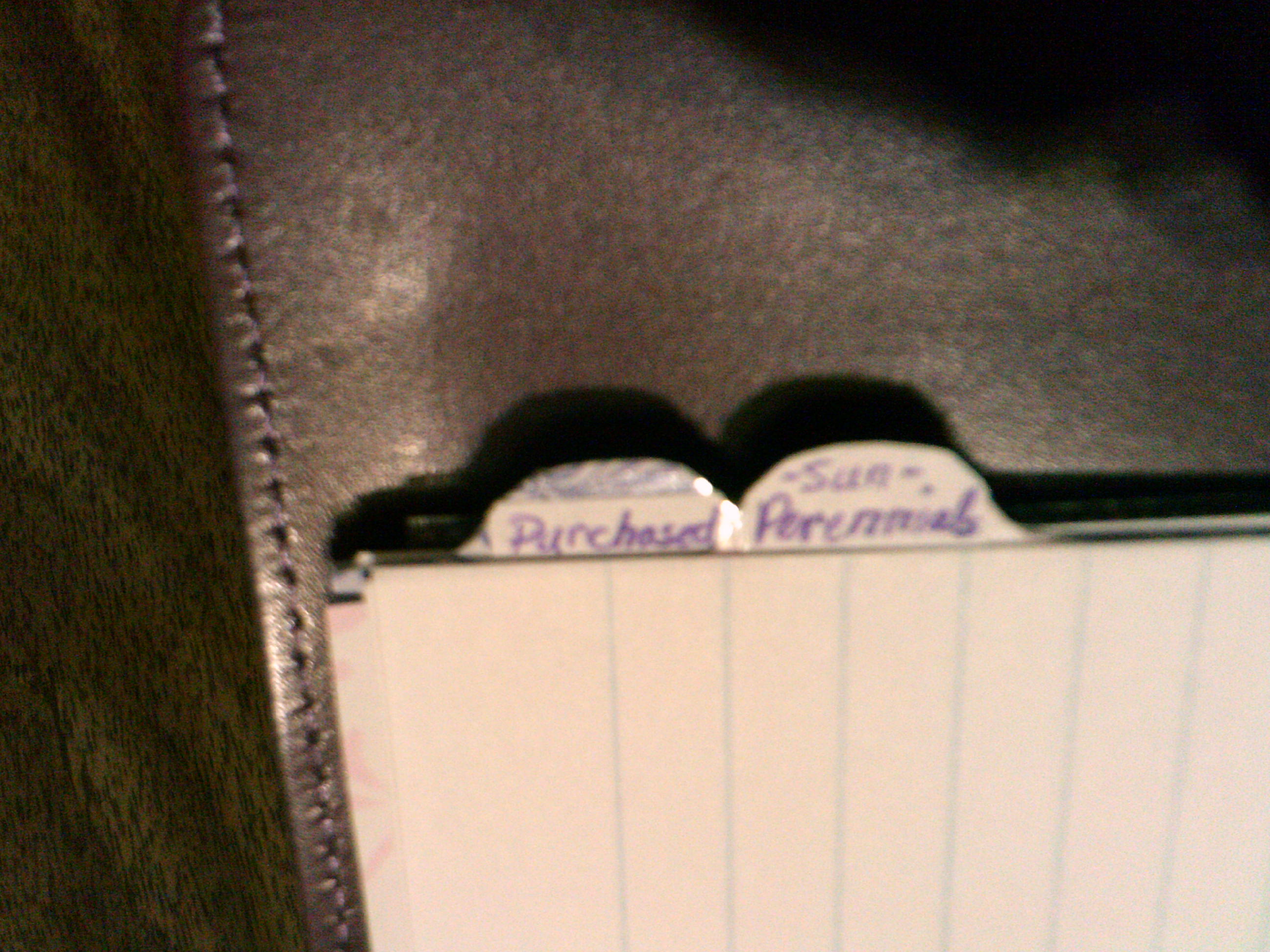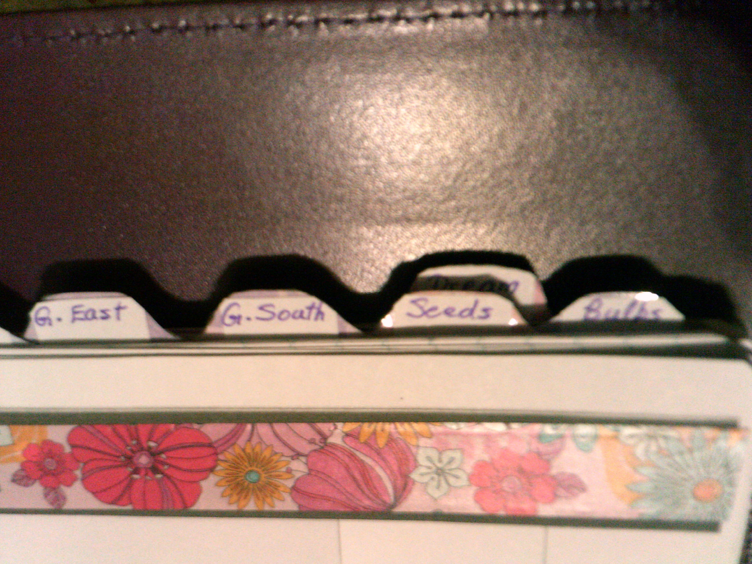 Diary- I found a calendar that was almost the right size, photocopied it, then trimmed it and turned it sideways to fit the planner. This is where I’ll keep track of hours worked in the garden and when posts are due. Next year I hope to also keep track in this section of when plants in my garden bloom as well. There are only the September to December this year in this section now; the hunt is on for 2014, although I may already have something that will work.
