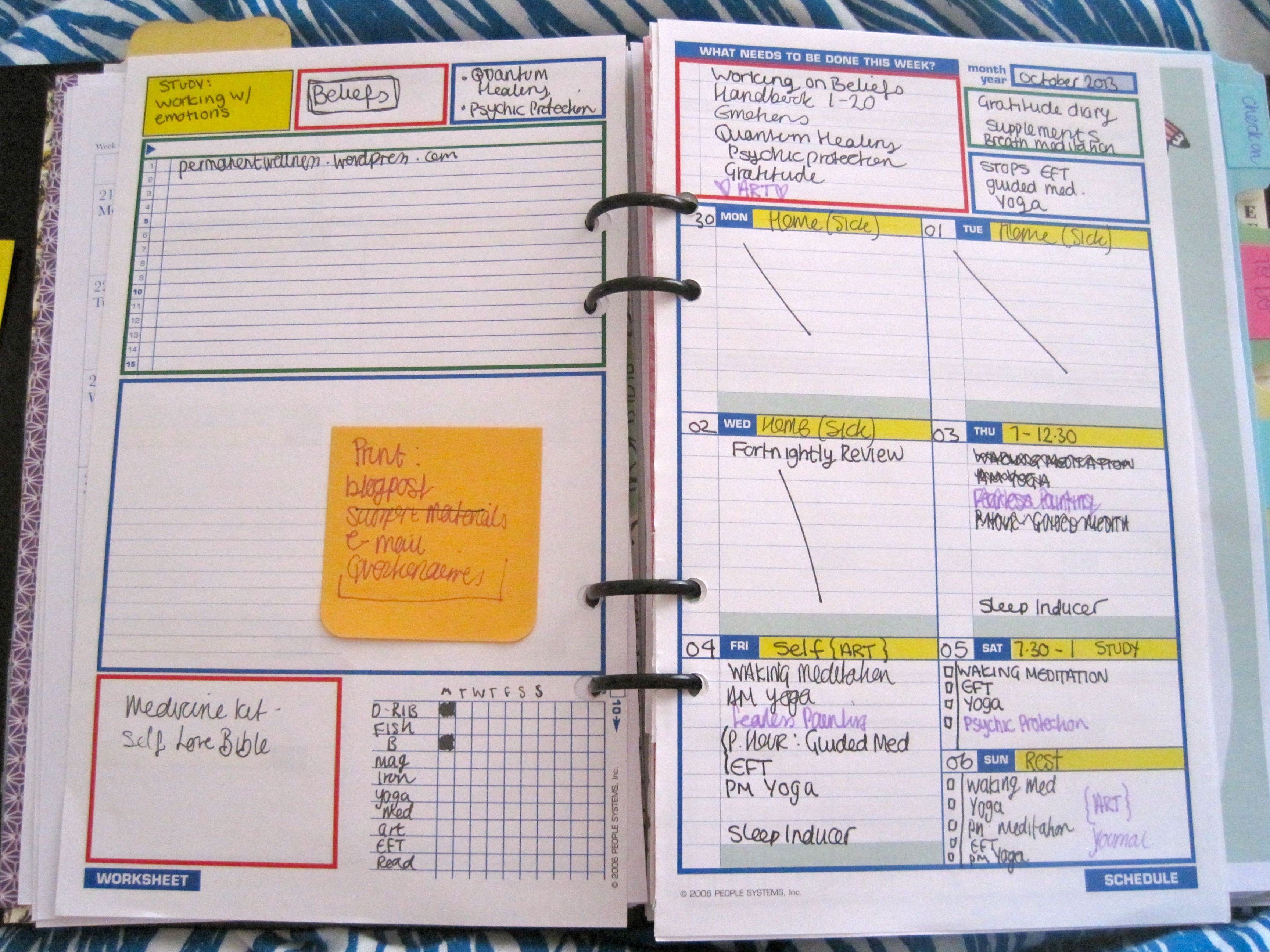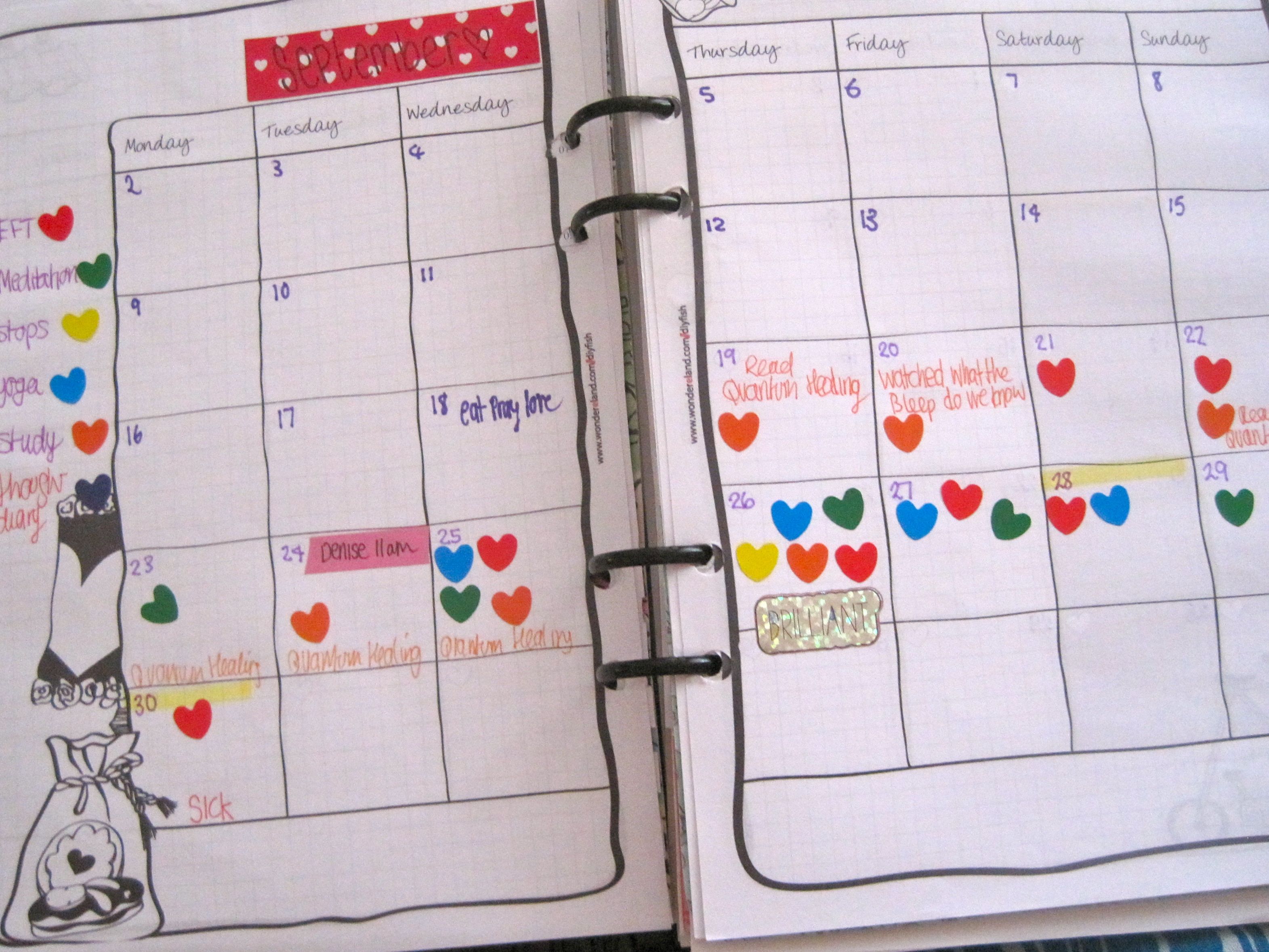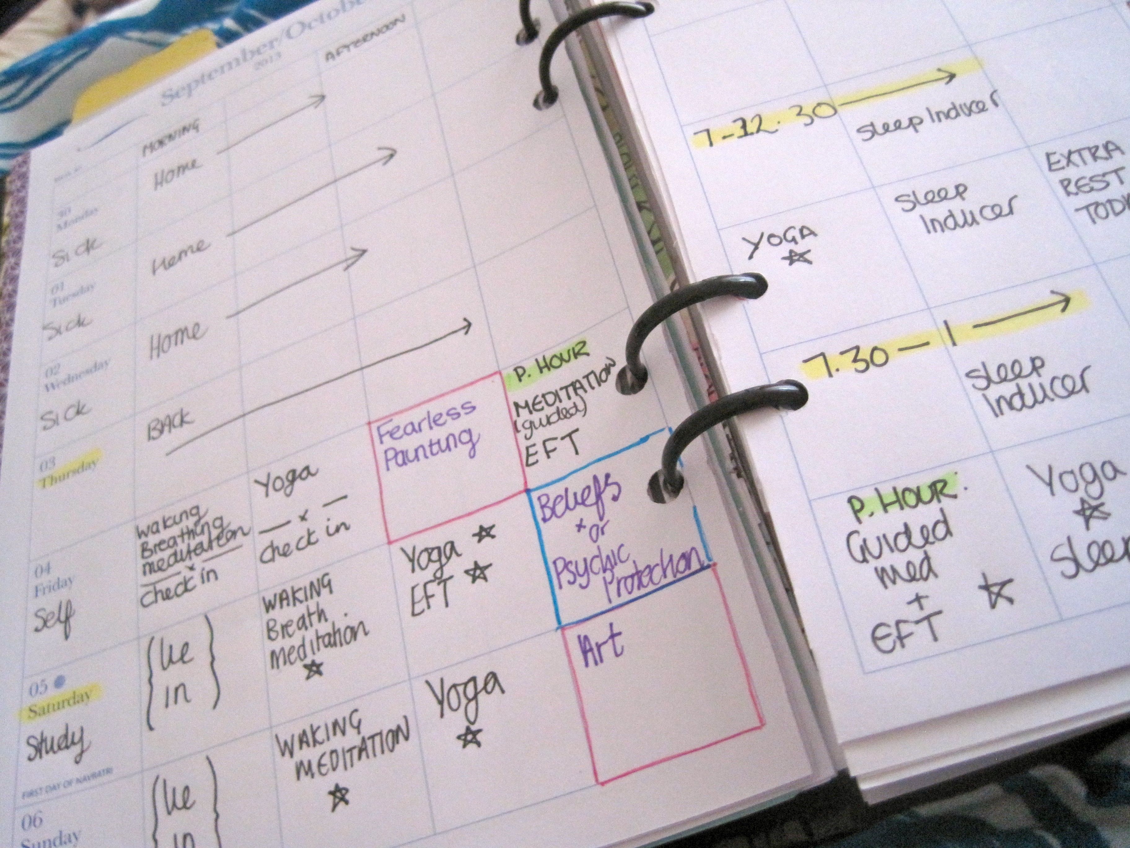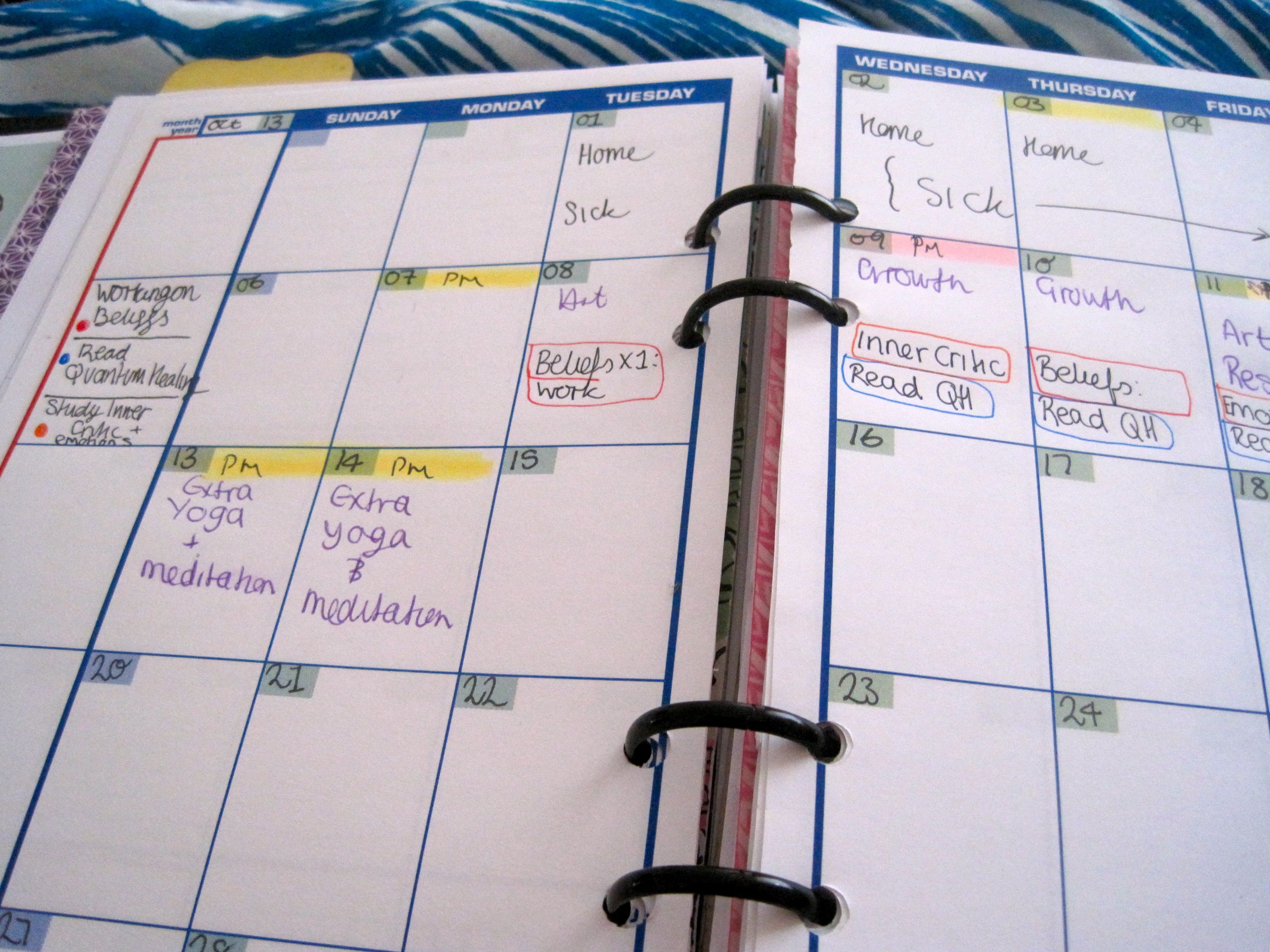 My days should consist of yoga, meditation, EFT (google it, it’s very very interesting!) and other psychological techniques to change thought patterns and beliefs. On top of this I still have many things to learn, and new tools to implement, so a calendar is what I thought I needed to stay on top of things.