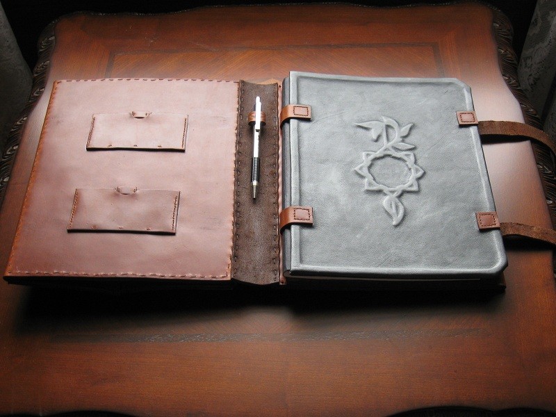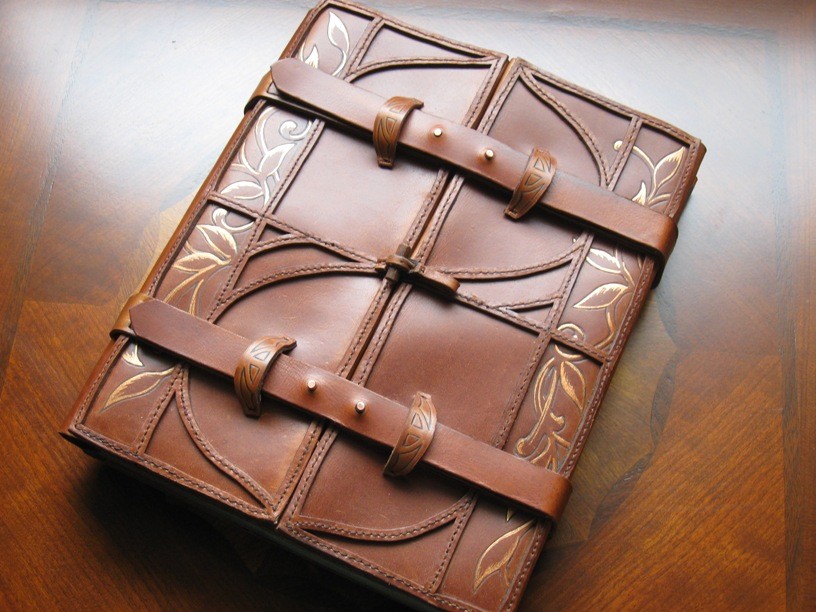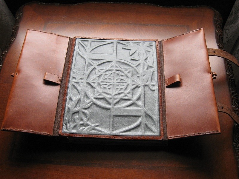 The book has a secret compartment at the front which opens to reveal carved ‘stone’ panelling in leather (all done by hand). When you close that one up you open the back which has more ‘stone’ panelling. Every stitch was sewn by hand and the brown leather is one single piece. I have a huge collection of hand bound books and this is easily the most beautiful one.