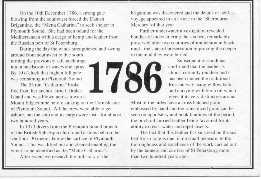 In 1973, divers off England’s Plymouth Sound found the wreck of an eighteenth century brigantine that sank in 1786 with a cargo of reindeer hides. They had been cured in baths of rye or oat flour and yeast, hand embossed with a varied cross-hatching before being soaked in wood liquor, hand curried and then soaked in seal oil and birch tan oil. The result is a unique finish that cannot be replicated.