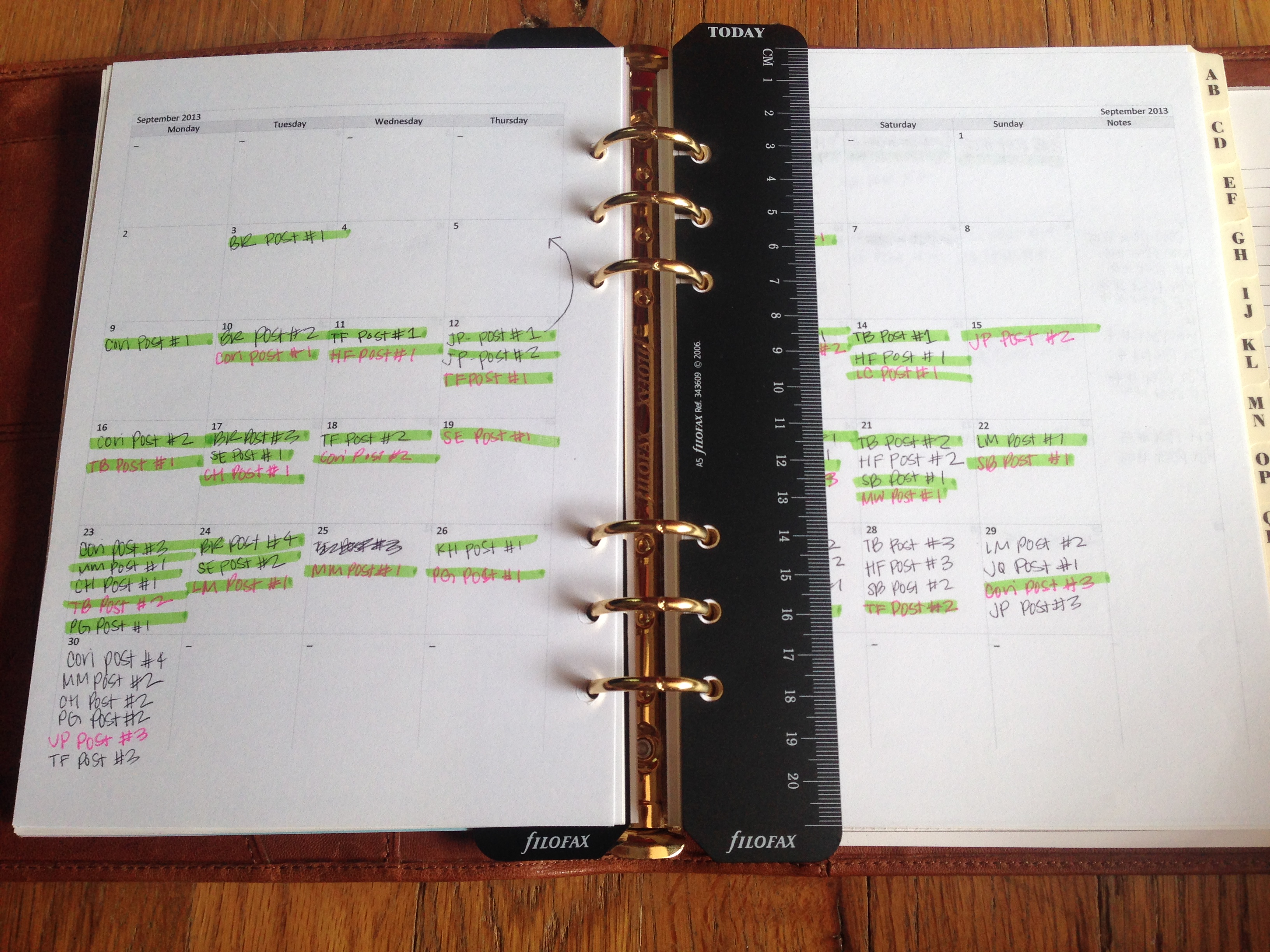 The Siena is as beautiful as ever. And it’s definitely keeping me on track of The Filofax Project and my job search. Not much has changed with my use of the monthly pages – I’m still using the color coding system to keep up on the date I receive posts and the date I get them posted. This photo was taken a while ago – I’ve definitely received and posted more projects since then!