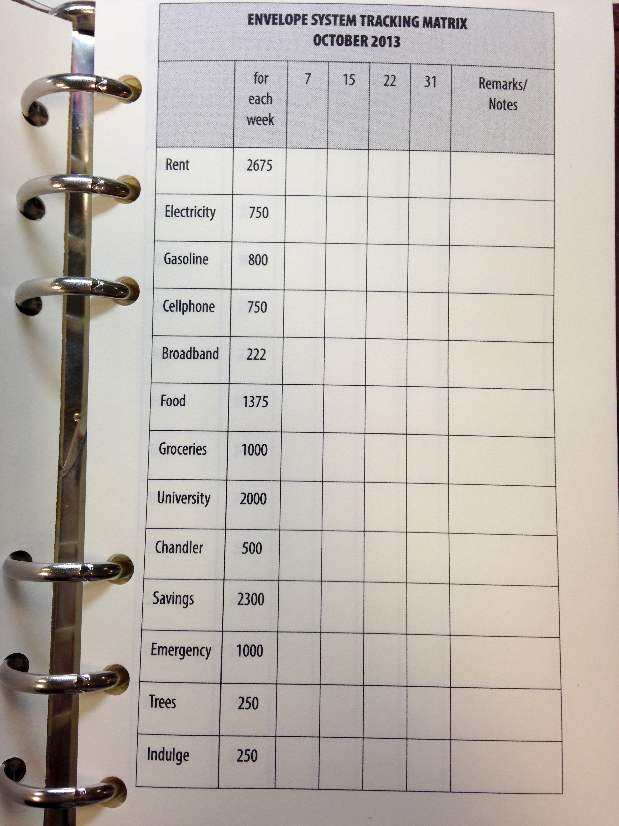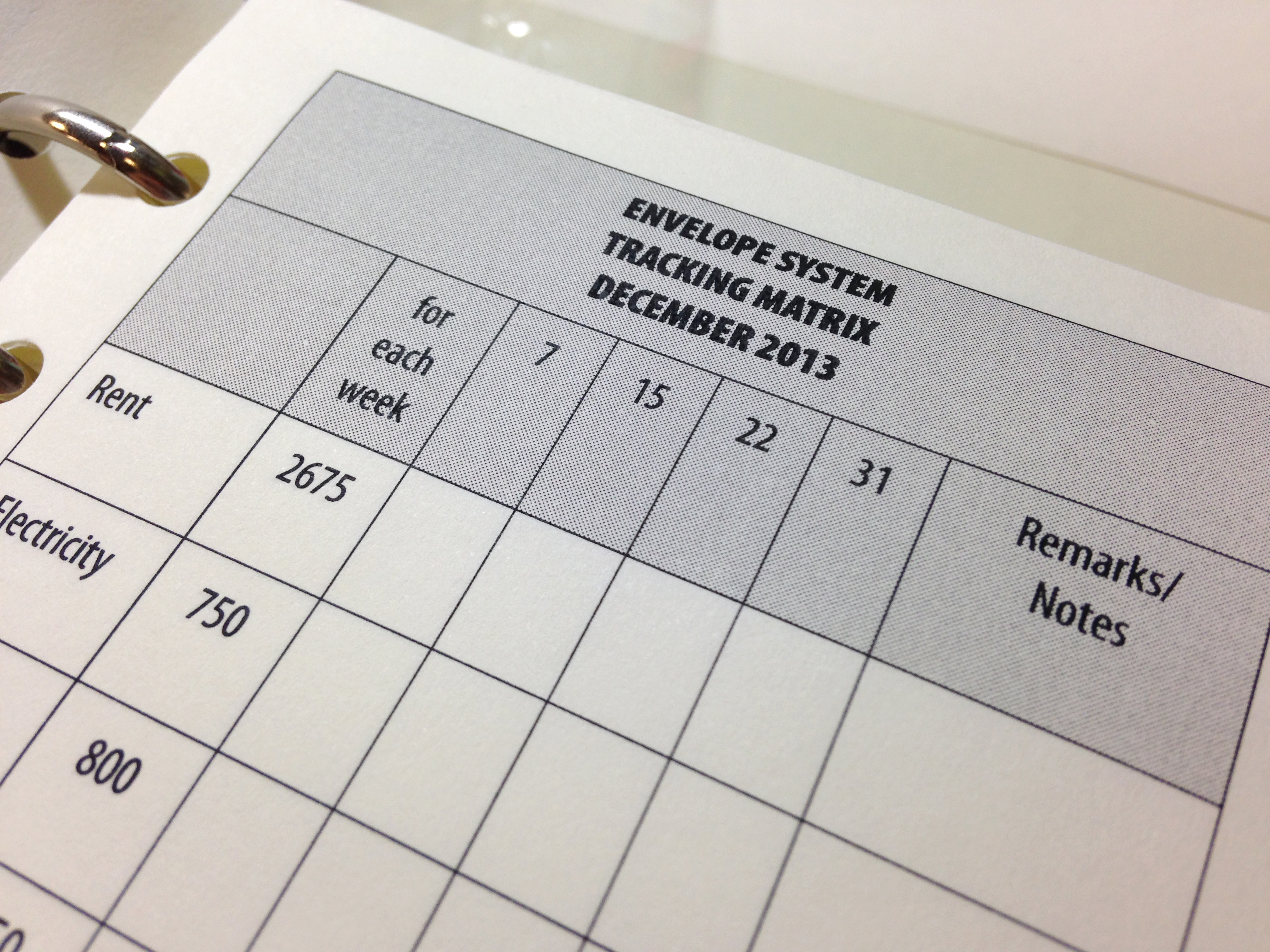 The leftmost columns stand for the areas in my life (let’s call them “accounts”) that I need to spend for. On the column immediately to the right of them, I have placed the cash amounts per week that I need to put in. For each payday that I am able to put the amount allocated into the pertinent envelope, I will write a check mark on the box, to remind me that all is well for that account for that particular week. For good measure, I have also added a box for remarks or notes on the rightmost column, just in case I need to remember something about that account. (Sometimes I get a rebate on my broadband and cellphone payments. That’s always a nice detail to note down.)