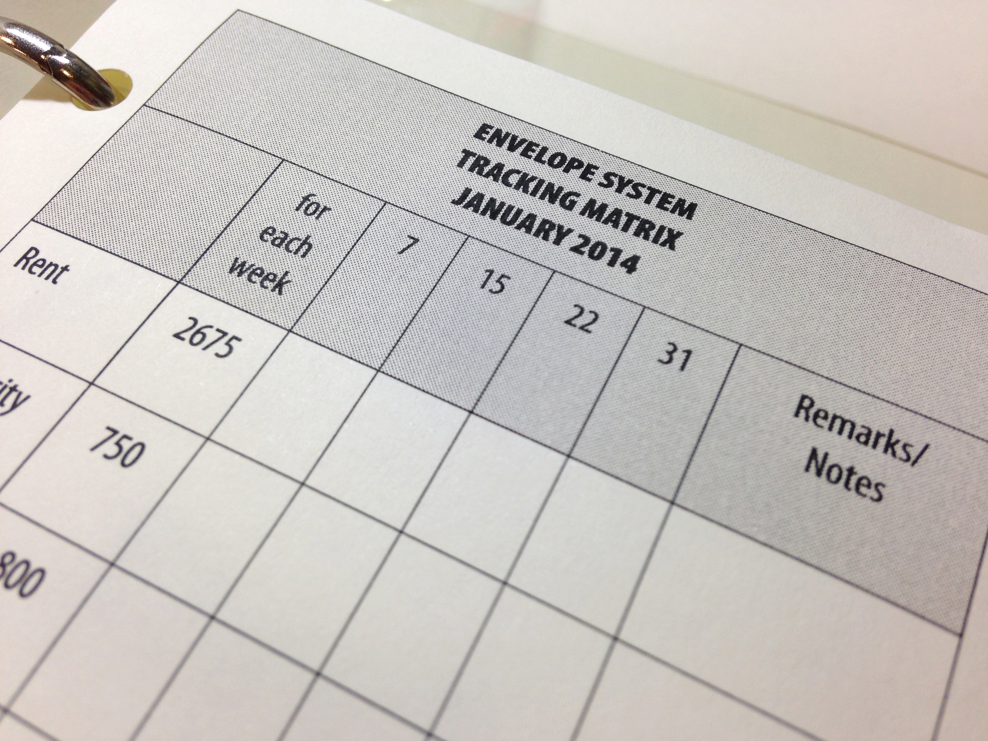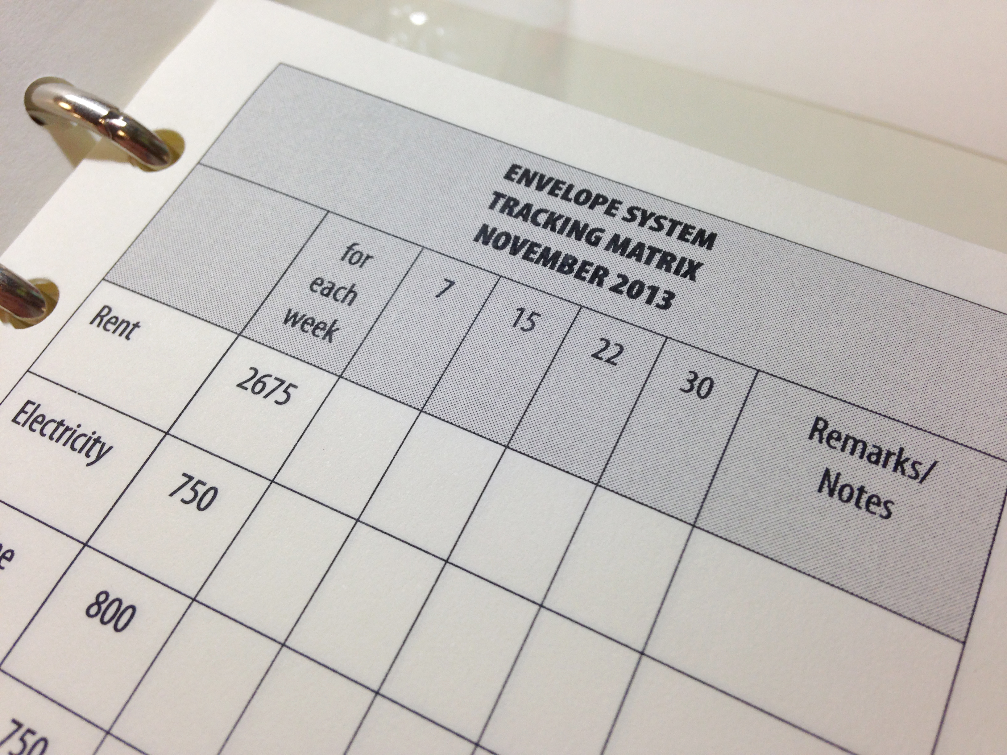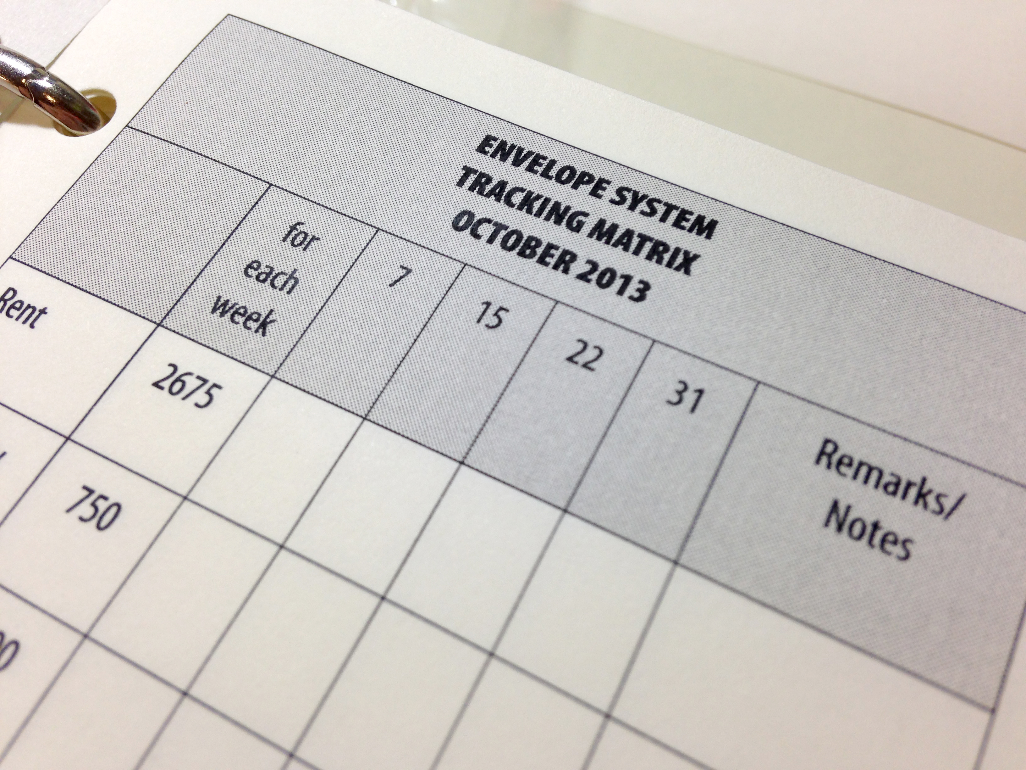 Next I have the tracking matrix. This is where I put check marks and notes that correspond to each activity that goes on in every envelope.
