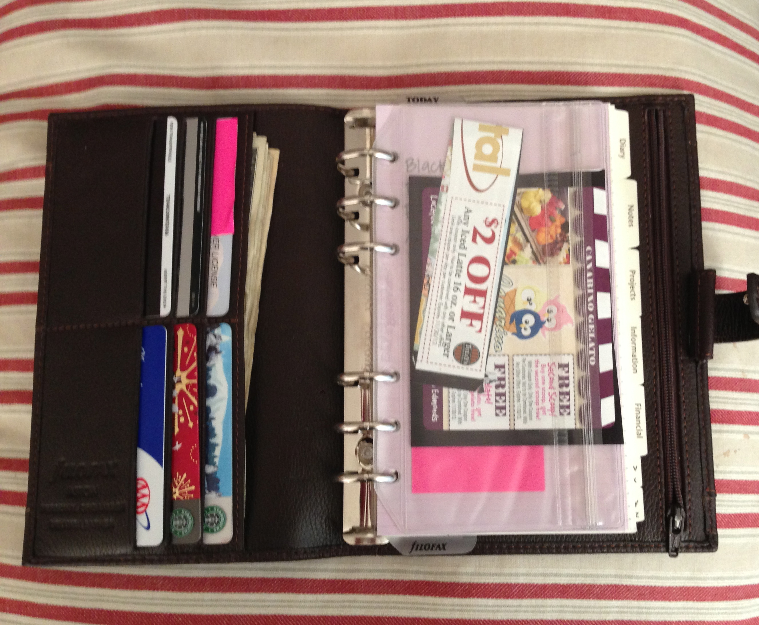 In the front I have the most important cards (yes, Starbucks cards are important!) and some cash. I am using the little zippy pocket for coupons because I am forever forgetting them and if I have them next to my payment methods I’ll see them and, well, use them! Behind the zippy pocket is the dashboard and a whole bunch of notepaper (thanks for the pretty colors Gail!) The reasoning for the paper’s placement is two fold: 1) super easy to write and see notes, lists, etc. with the paper up front and 2) I needed something to even out the topography created by the cards when I’m writing in the diary on the left….which just happens to be the next section.