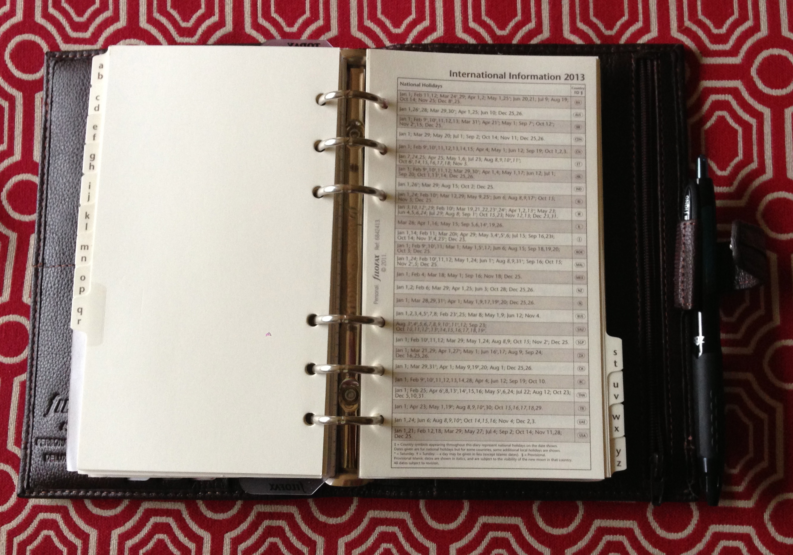 Here I keep my personal information, reference material, ongoing lists like books to read (under b) movies to watch (under m), etc. Finally, the zippered pocket in the back? Only holding stamps and calling cards.
