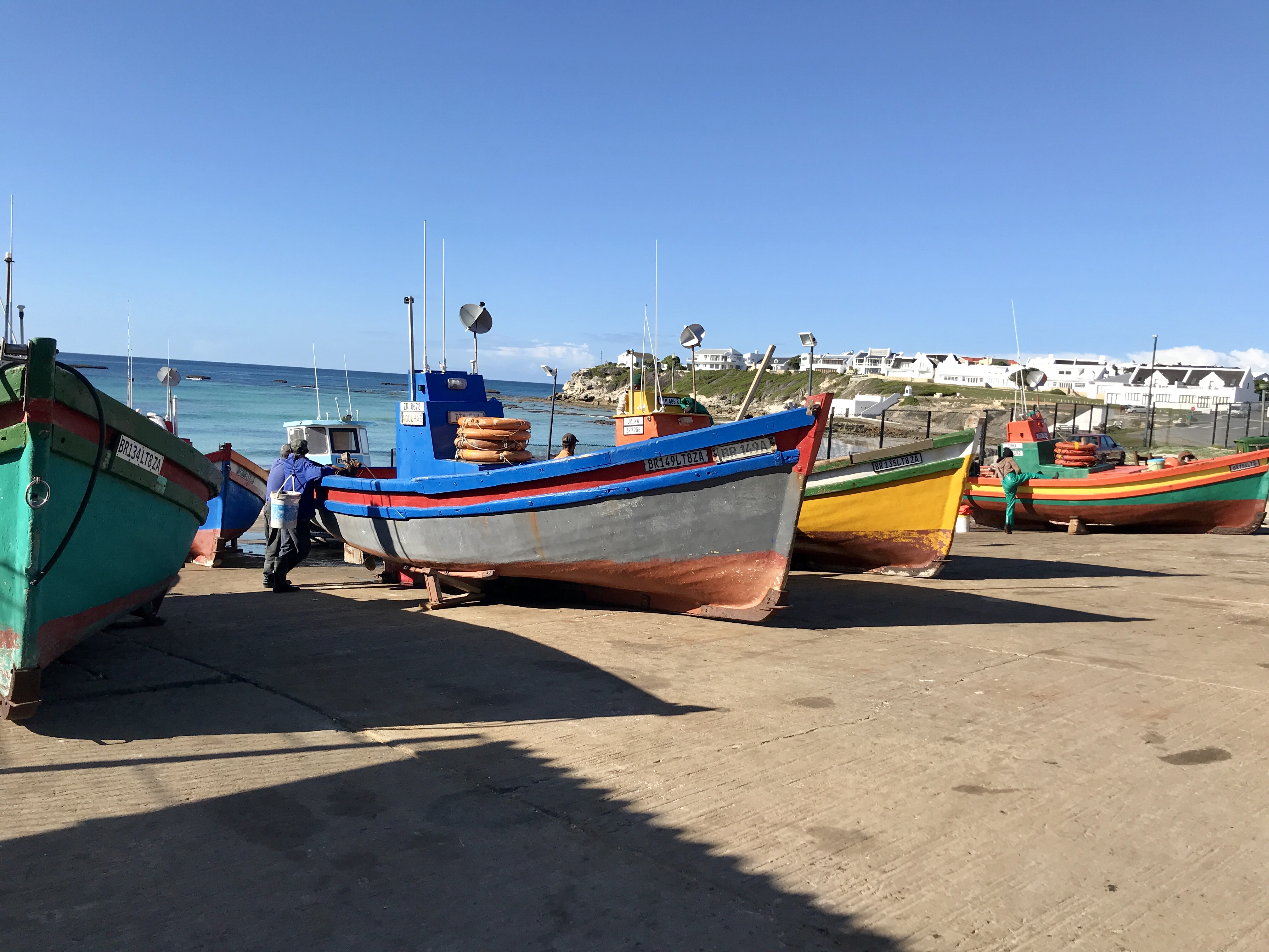 After a yummy breakfast of the usual (muesli, bran muffin, and latte), we went to watch the chuckies (wooden fishing boats) come in. They usually go out from 7am to 6pm but today they came in at about 11 because there was military weapons testing being done by the Overberg Test Range (a weapons systems testing facility ) in the harbour. The fishermen are recompensed for their reduced catch.