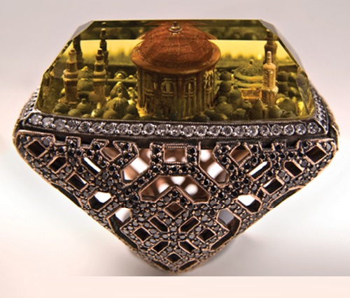 He makes them by sculpting translucent gemstones like aquamarines, citrines and even emeralds, using dentists’ tools to carve into the underside of the gems, a slow and painstaking process known as inverse intaglio. The shapes are not always of buildings: A “Lalezar” or Tulip Garden ring features petals engraved inside an amethyst.