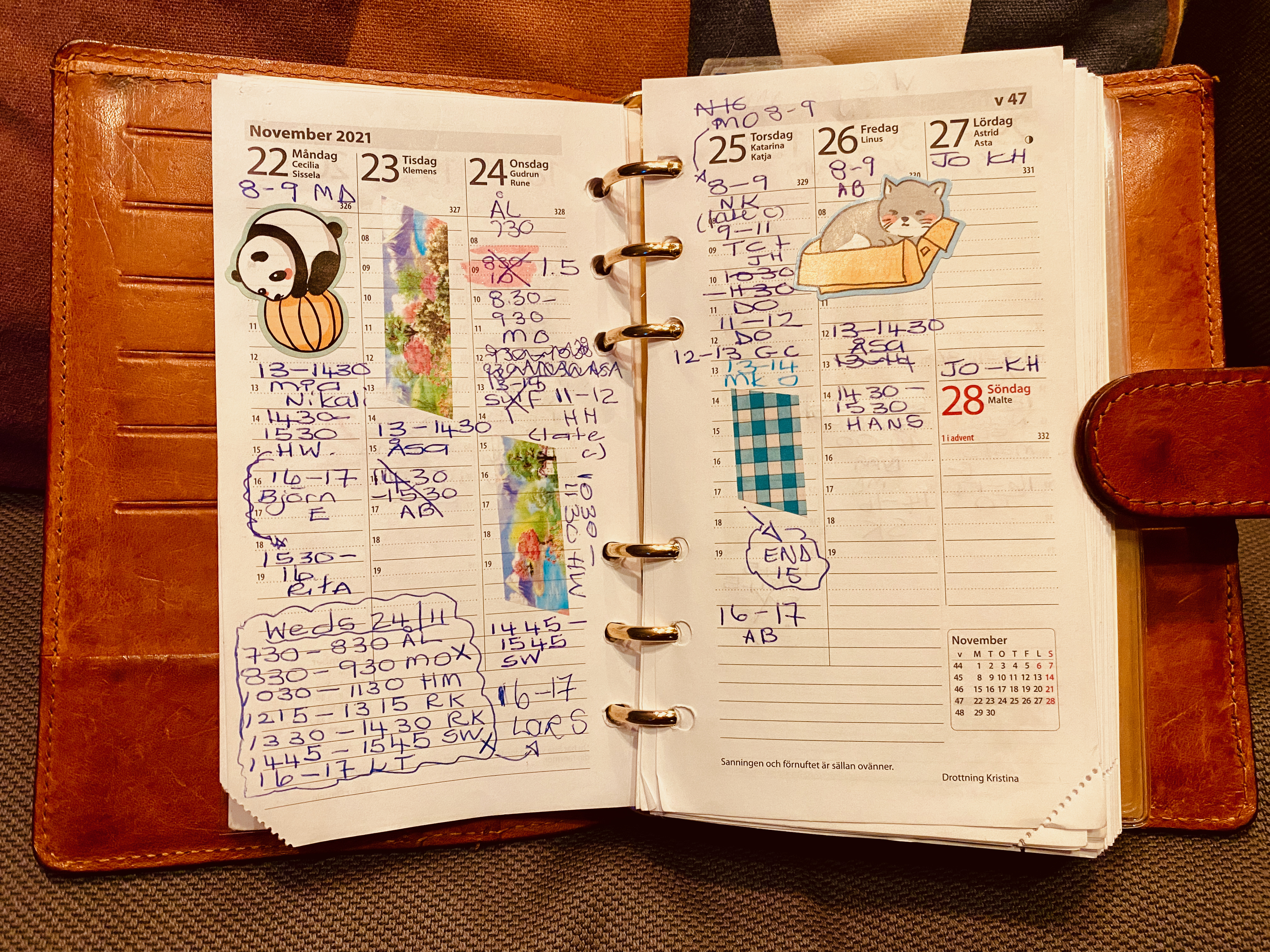 My calendar this week looks exactly how the week has been in Sweden. Changes, late cancellations, crossing out, scribbles, illegible notes. A little dramatic, some stress.
