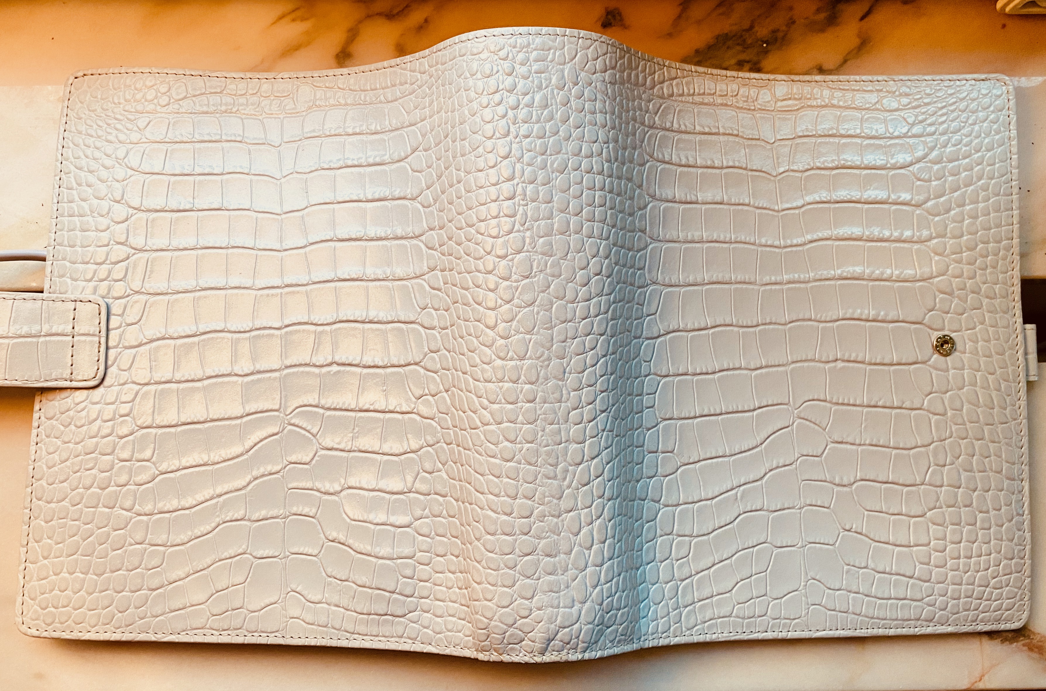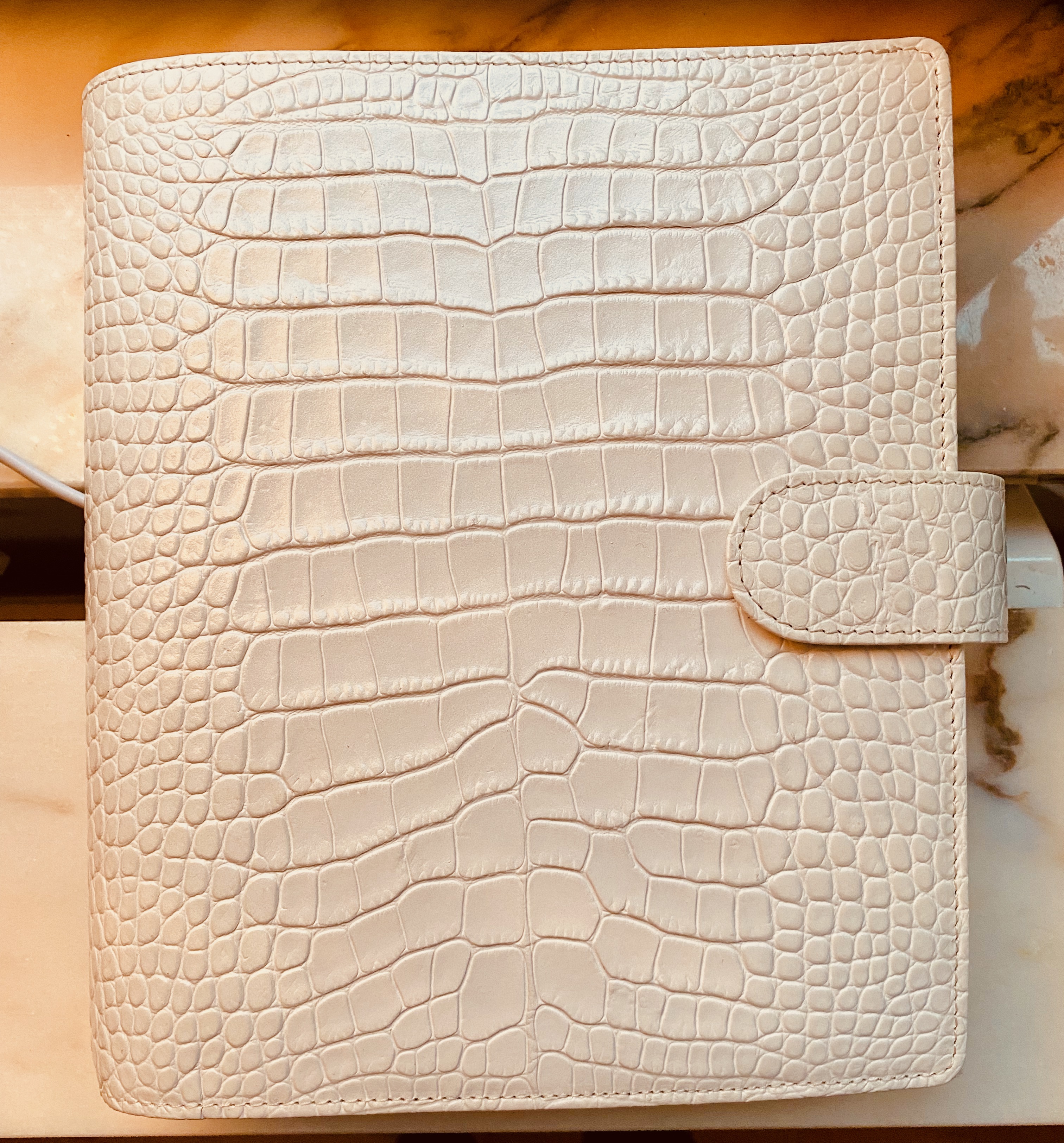 and as of yesterday, I now have a beautiful A5 Manager in Beige Croco. This leather is gorgeously smooth and would easily wipe clean. I always used to use A5 binders for work, but changed to personal size about 8 years ago when the A5 size became too big and inconvenient to carry. I still use A5 binders at home though, to hold bills, to do lists, recipes, guarantees, itineraries etc. This one is going to hold 2022’s travel (hopefully) details, renovation documents for our bathroom, and our bucket list. The nicest thing is that even though this binder is light coloured, it can be wiped clean.