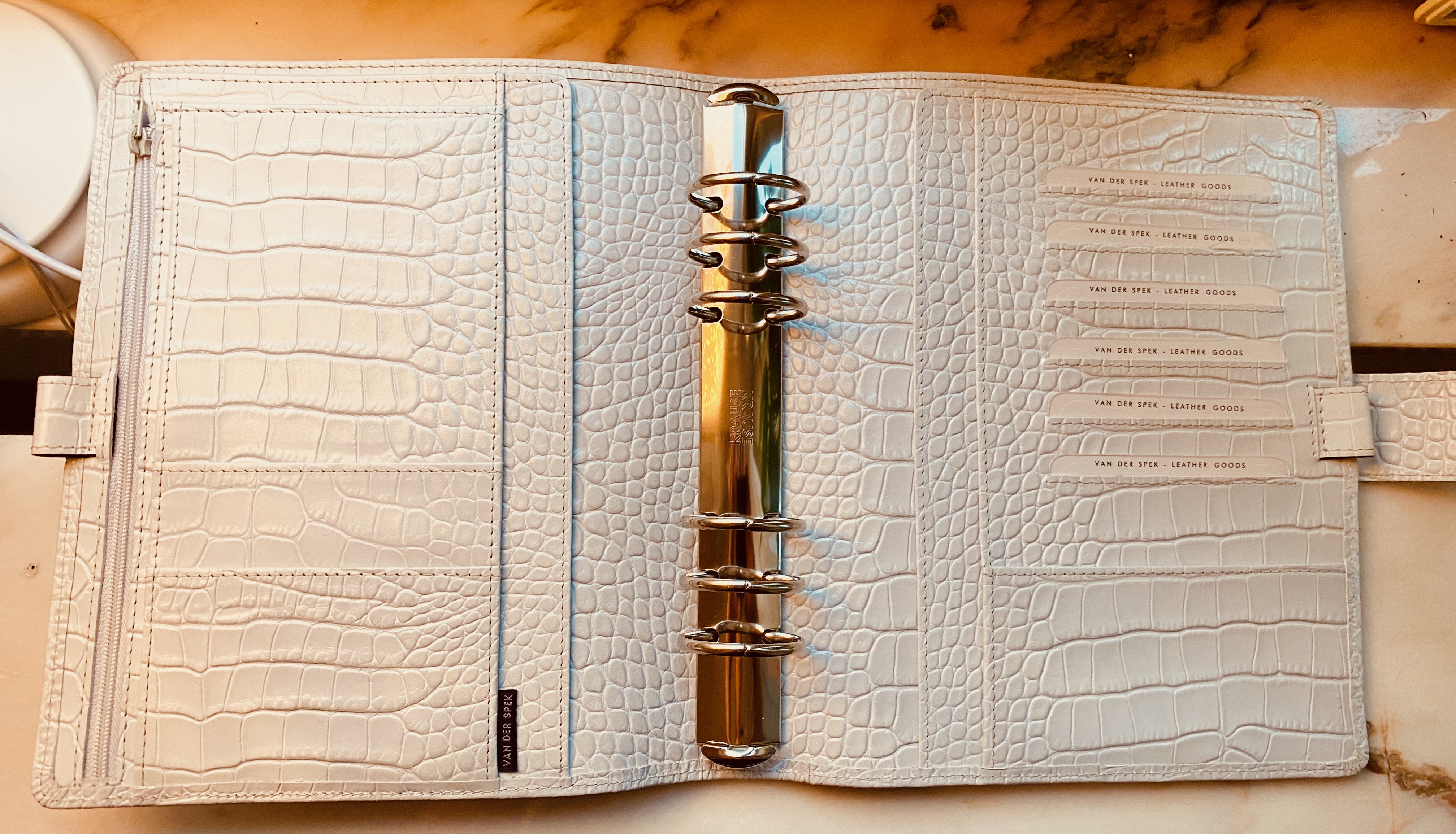 Your new planner is beautiful! I ordered the Van Der Spek A5 Manager Touch Me in Stardust Croco. It hasn’t shipped yet because I also ordered custom widened zippered compartments. This is my first time having them widened, so it is a bit of an experiment. I like to have the leather fly leaf and leather zipper compartment curl around the rings and act as a ring protector. It is not perfect, but it does help. I’m so excited for my new planner to arrive!