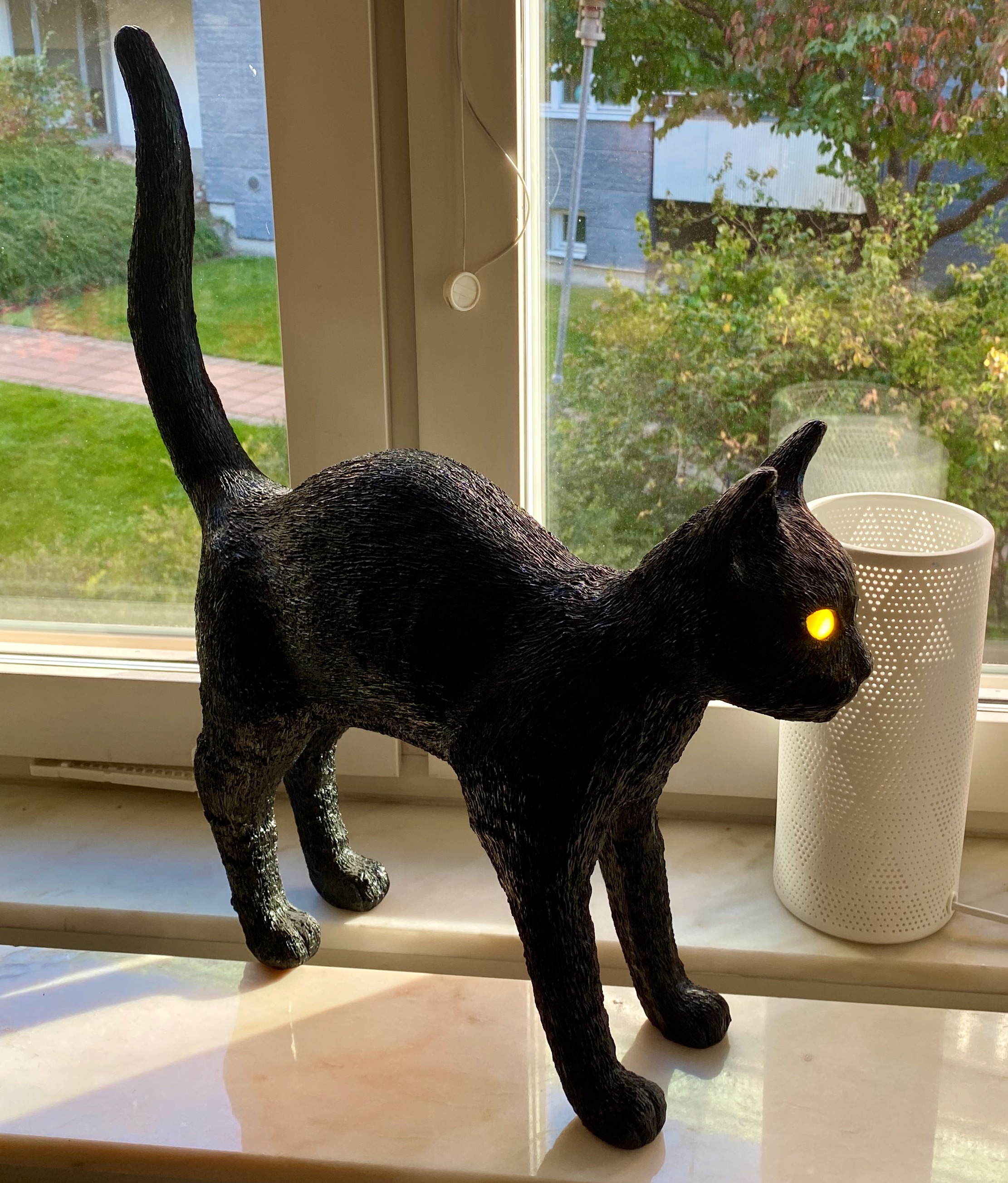 This weekend I found a Seletti Jobby the Cat lamp in perfect condition. These lamps cost about $350 new. I have always wanted one of their cat or monkey lamps. Now I have one! It is rechargeable (the light lasts 30 hours) and you turn it on and off by touching its private ‘bits’ (clearly marked in gold)