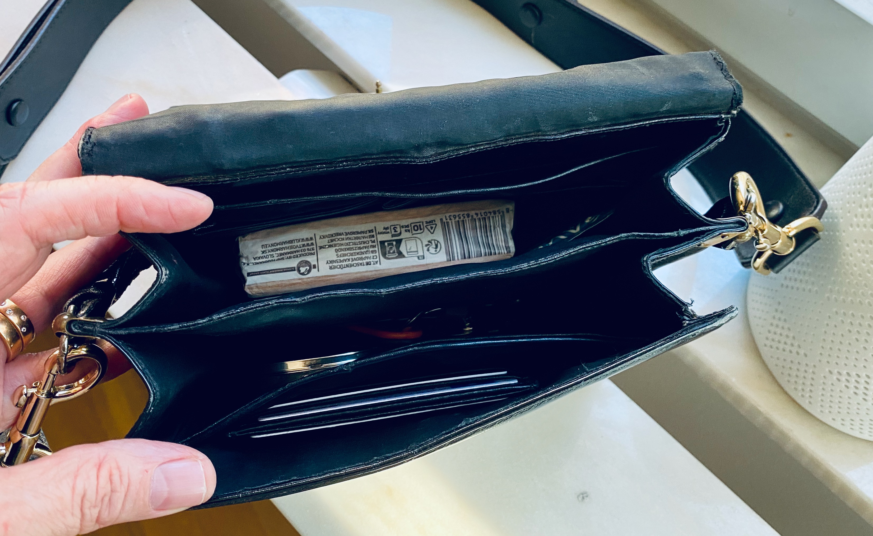This bag is surprisingly roomy, with multiple inside slip pockets. My ‘exotic’ pocket Tejus and phone cover fit easily into the bag so it is perfect to carry for a light workday or trip into town. My umbrella and larger planner do not fit, though, so it is not suitable for a normal work day or a day with shaky weather.