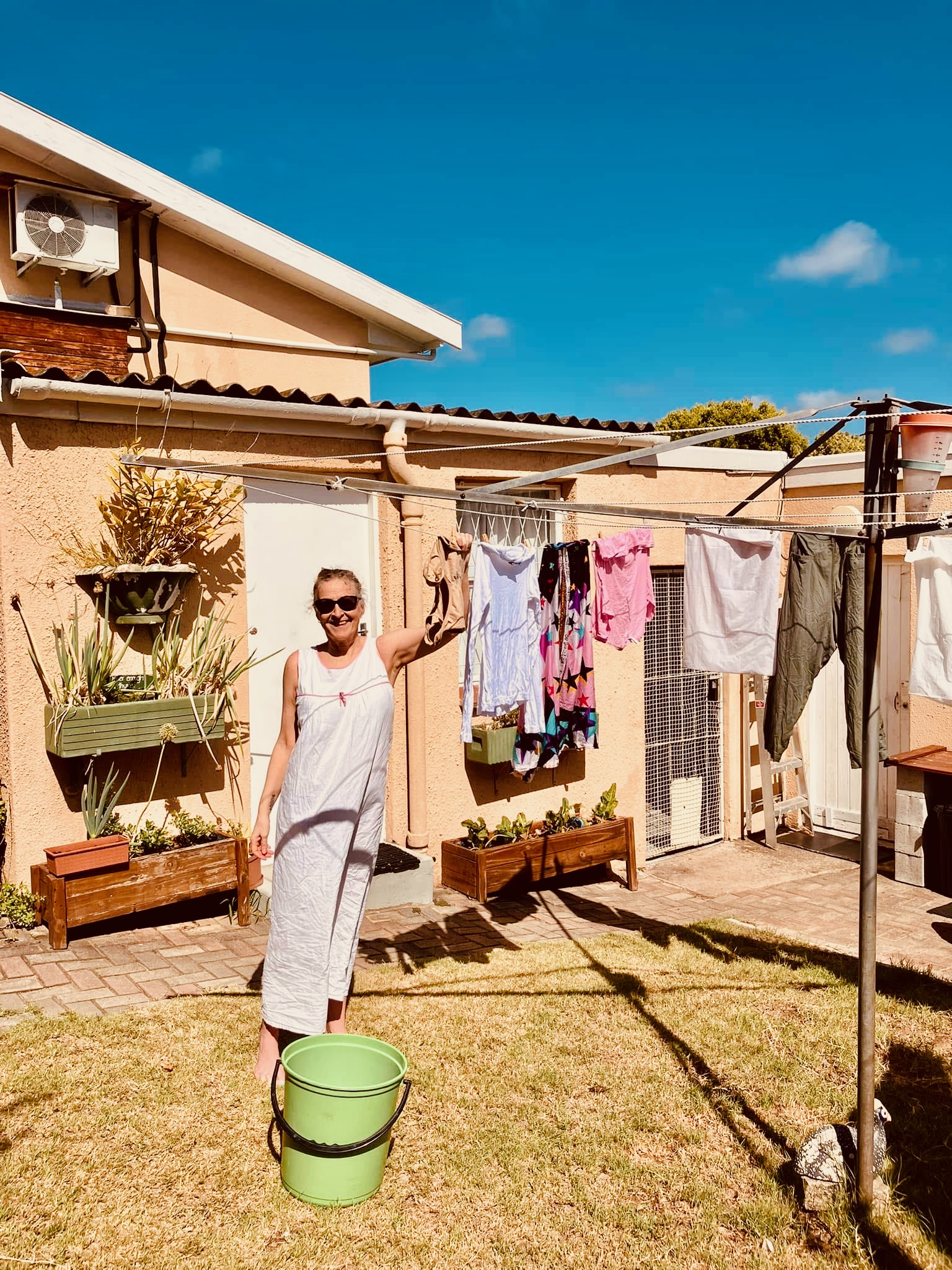 This is a handmade pure cotton empire-line dress that is so comfy in the heat. It has a built in ‘petticoat’, which is also light. The length is absolutely perfect. One person has stopped me to ask where I bought it.