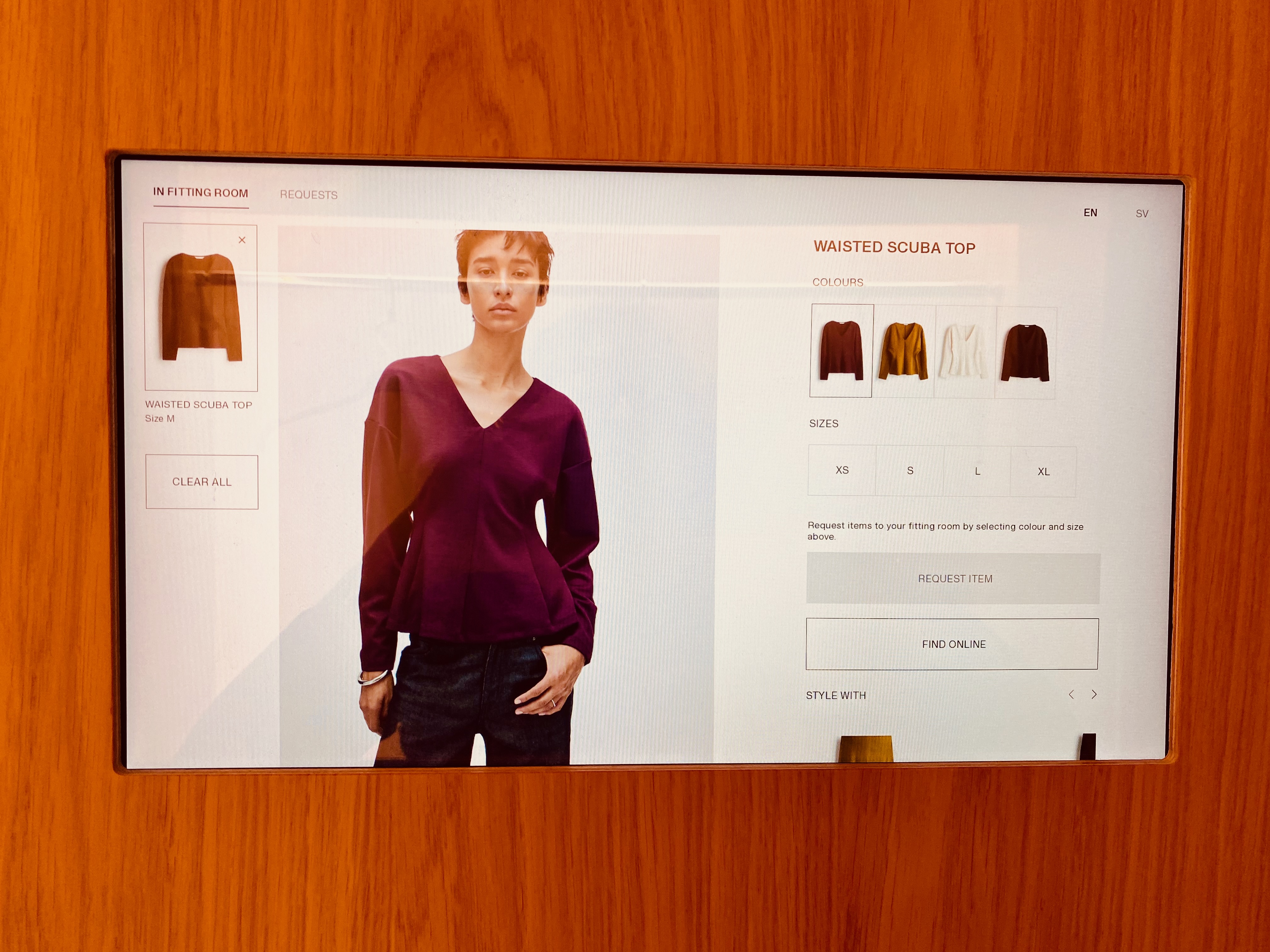 When you walk in to a fitting room, a screen on the wall registers the items you have with you. It then shows the different sizes available, has a button to call the attendant if you need another size, and also allows you to buy online. At the bottom of the screen are suggestions on what other garments go well with it.